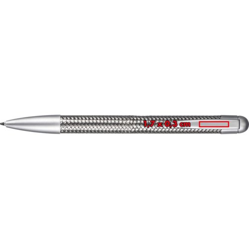 Silverfärgad metallkulspenna med clip och tryckknapp.