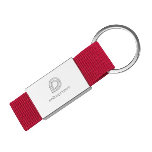 Röd tygnyckelring med metallring.