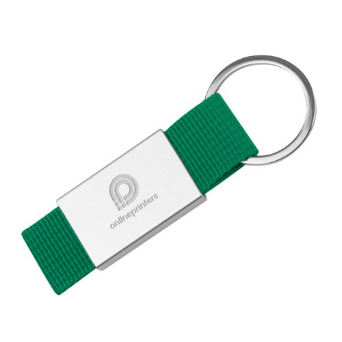 Grön tygnyckelring med metallring.