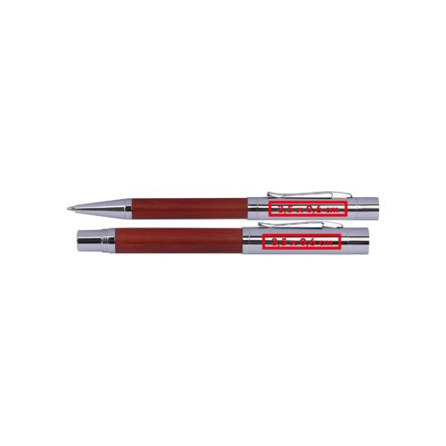 Brunt trä skrivset med en kulspetspenna och ett etui.