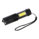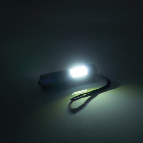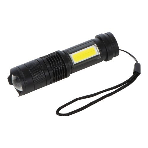 - uppladdningsbar COB-ficklampa av plast med två olika ljuslägen (normal och blinkande) samt justerbart fokus och ytterligare en lampa på handtaget inkl. laddningskabel (USB- till USB-C-port)